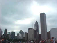 SaturdayJuly 8, 2000Saturday was mostly a day of getting from one place to another. Laura was getting from Las Vegas to Chicago. Robert was getting from Seattle to Chicago. Laura beat Robert, but Robert had a cooler plane. His plane had little TV sets that showed different channels. He watched the "Shorts" channel and saw some pretty funny short movies (including Rant and Holiday Romance). We get to our hotel, The Regal Knickerbocker, which is an old hotel right in downtown Chicago. There, we discover that we're just in time for the "Taste of Chicago," which is like the "Bite of Seattle" only more humongous (3.5 million people show up over the course of 10 days). After chomping down on some grub, we kick back on the grass and listen to a free concert by Kansas and Yes. It's warm and muggy, but the occasional breeze off the lake makes it nicer (one breeze feels so good it gets a bigger round of applause than Kansas did!). For a while it looks like it's going to storm (bystander comment: "Boy, they're sure playing up a storm!"), but it never does. Laura takes a few shots of the clouds and the Chicago skyline. We caught a cab back to our hotel where we collapsed on the bed and tried to figure out if we were two hours ahead of where we were this morning or two hours behind. We gave up and went to sleep.