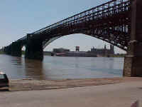 Day 7Friday, July 14, 2000And a lovely Bastille Day it is, too. We decide to celebrate by seeing the somewhat famous St. Louis Arch, which is located in St. Louis, and is an arch. Unfortunately, they chose to locate it in downtown St. Louis, which is not known for its accessibility by 30 foot long, 12 foot 6 inch high motor homes. After a little nutty driving and a few frayed nerves, we manage to park in a No Parking zone (all the parking garages were too short for us) in front of a bunch of buses also parked in the No Parking zone. We figured that if they started ticketing at the far end of the line, we'd have a chance to see the arch and make it back. The Arch is located in a park and the whole joint is a monument to Western Expansion. It's located about where Lewis (who was named after the city) and Clark (named after the Air Force base) left for their westward trip (give or take a few counties). The idea is that St. Louis is the Gateway to the West, and the Arch symbolizes that, because they said so. The arch itself is pretty damn impressive. It's 630 feet tall (80 feet taller than the Space Needle) and took about three years to build. There's a little train that runs inside it up to the top. We didn't go on that because it's small and when you reach the top, you're way high up. (Robert has this tiny little fear that if he goes up high, he'll fall down and break something. Since he's been in the hospital twice as a result of going up high and falling, Laura tolerates his phobia.) There's a lovely visitor's center at the foot of the arch (actually under the arch, since it's underground). That's where you buy tickets to ride the train. They also show two short movies, one about building the arch (very good, although the characters weren't very well developed) and one about Mark Twain (which we didn't see). We definitely recommend the Building of the Arch movie. Until we saw it, it didn't occur to us that building a 630 foot tall steel arch would be that big a deal ("You just build it on the ground and raise it, right?"). Not only is it a big deal, but (and this is our favorite part) not one person was killed building it! When you see these construction workers standing around 630 feet off the ground with no safety harnesses, you realize how amazing that is. The following text is taken from two plaques we read while waiting in line to see the Building of the Arch movie. (And, no, we didn't write these down at the time. Robert took a picture of the plaques with his digital Sony Mavica camera and then transcribed it later.)